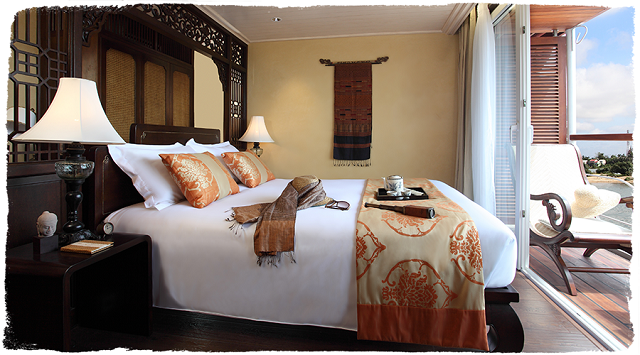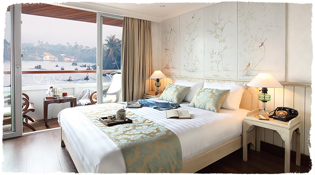 Situées sur le pont supérieur et d'une superficie de 24m2, chacune des 11 cabines de luxe (3 cabines de 2 lits, 8 cabines d'un grand lit, 1 communiquante) ont un balcon (5m2) et une salle de bain qui est séparée de la zone de couchage par une porte coulissante en bois. Les meubles anciens en bois donnent un ton très chalereux aux cabines et l'évier en cuivre rustique dans la salle de bain donne le sentiment du mode de vie en Indochine pendant les années 1930.