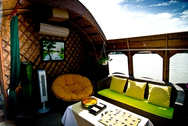 - Capacité maximale : 16 personnes, le sampan est construit en bois et son toit en rotin