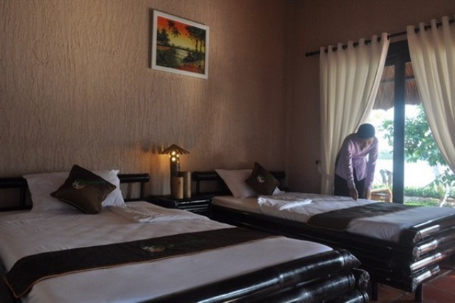 Mekong Lodge resort Cai Be est l'endroit idéal pour un voyage dans le delta du Mékong au Vietnam. Le resort vous emmènera dans un autre monde : un monde aquatique bordé d'une végétation luxuriante, un monde où les gens ont une vie détendue et heureuse.Mekong Lodge resort Cai Be se compose de 36 bungalows privés et d'un restaurant au bord de la rivière, s'étend sur une superficie de 12.000m2. Il est situé sur une île flottant sur le Mékong, le seul moyen d'accéder au resort, c'est prendre un bateau. Nuit à Mekong Lodge resort Cai Be.