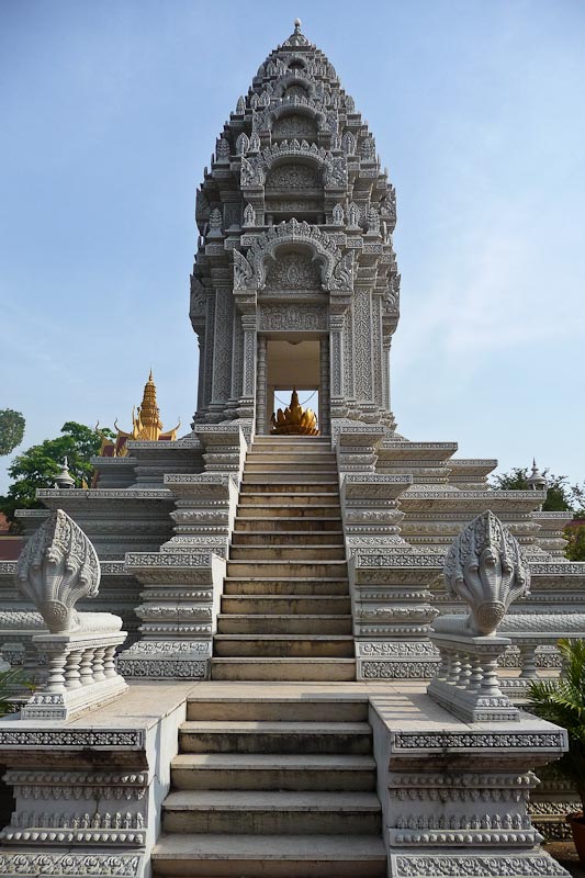 - Dans l’après midi, visite de la capitale : Visite du Musée National, du temple de l’art khmer inauguré en 1920 qui abrite principalement des sculptures datant des différentes périodes de l’histoire du Cambodge, du Palais Royal construit en 1866 par le roi Norodom constitué de différentes structures regroupées dans une enceinte, de la Pagode d’Argent abritant des chefs d’œuvres tel un bouddha en or massif incrusté de 9584 diamants et pesant 90 kgs ainsi qu’un bouddha d’émeraude et de cristal de Baccarat datant du 17ème siècle.